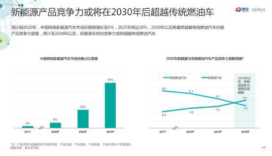 值得關(guān)注的是,《新能源汽車(chē)報(bào)告》預(yù)估新能源汽車(chē)的產(chǎn)品競(jìng)爭(zhēng)力將在2030年超越傳統(tǒng)燃油車(chē)。其中從市場(chǎng)份額上來(lái)說(shuō),易車(chē)預(yù)測(cè)到2020年,中國(guó)純電動(dòng)車(chē)市場(chǎng)份額將增長(zhǎng)至6%,2025年將達(dá)20%,2030年將最終超越傳統(tǒng)燃油汽車(chē)份額。而從產(chǎn)品競(jìng)爭(zhēng)力指數(shù)(包含市場(chǎng)需求度、產(chǎn)品功能、產(chǎn)品性能、產(chǎn)品質(zhì)量、產(chǎn)品價(jià)格五個(gè)權(quán)重指標(biāo))來(lái)說(shuō),預(yù)計(jì)到2030年,新能源汽車(chē)的綜合競(jìng)爭(zhēng)力將超越傳統(tǒng)燃油汽車(chē)。