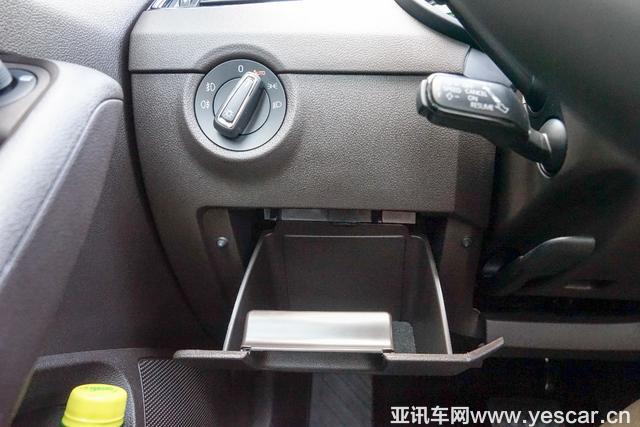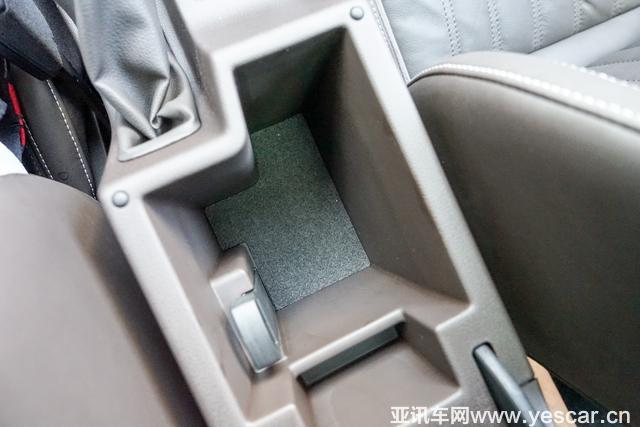 中控布局還是挺清晰的,空調(diào)區(qū)、功能區(qū)劃分很明確。機械手剎有點占儲物空間了,否則中央扶手箱空間還能更大一點。左手邊有個小盒子,放點零錢啥的很方便。