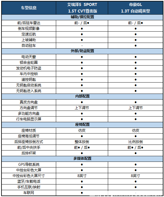 說來有趣,兩款車型在配置方面像是商量過或是有意較量,幾乎都是“你有我也有”,只有極為個(gè)別的差異,比如帝豪GL配有自動(dòng)駐車,而艾瑞澤5配有車聯(lián)網(wǎng)系統(tǒng)。這樣“爭先恐后”的競爭結(jié)果,無疑是給消費(fèi)者帶來更多的實(shí)惠。