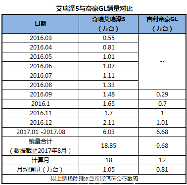 帝豪GL自去年9月上市,銷量也已達(dá)10萬臺,同樣是非常好的成績。由于上市時(shí)間相差半年,累計(jì)銷量自然會(huì)有差異,如果一定要把“受歡迎程度”做出個(gè)比較,那么對比月均銷量是較為公平的,而比較結(jié)果顯示,艾瑞澤5銷量高出一籌。