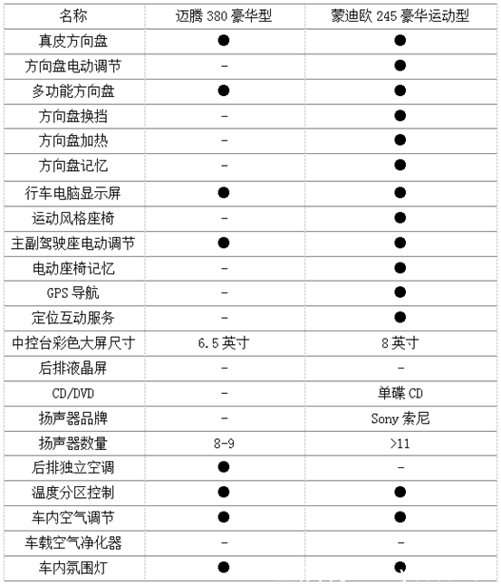 另外,兩款車均配備了真皮方向盤,握感都非常不錯。邁騰380豪華型配備的后排獨立空調(diào),值得贊賞。而新蒙迪歐245豪華運動型相較于邁騰380豪華型,配備了電動可調(diào)節(jié)方向盤、方向盤換擋、方向盤加熱、方向盤記憶、運動風格座椅、電動座椅記憶、GPS導(dǎo)航及定位互動服務(wù)。不容置疑,這個部分的比較,新蒙迪歐245豪華運動型同樣勝出。