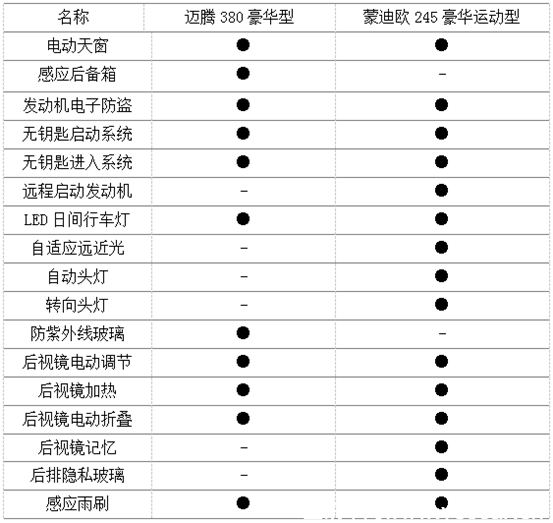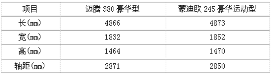 尺寸方面,新蒙迪歐245豪華運動型的長寬高尺寸更大,而邁騰380豪華型在軸距上稍稍占優(yōu)。