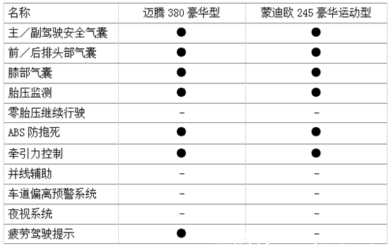 此外,在安全配置方面,兩款車型均有主/副駕駛安全氣囊、前/后排頭部氣囊、膝部氣囊、胎壓監(jiān)測等配置,邁騰380豪華型多配備了一項疲勞駕駛提示功能。而新蒙迪歐獨有的氣囊安全帶為安全性增分不少,綜合比較之下,兩款車型的安全配置實用性都很不錯。