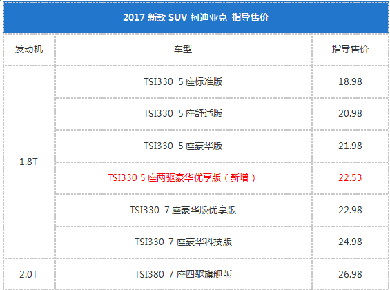 亞訊車網(wǎng)www.sbu3.com】目前,斯柯達旗下的2017新款SUV柯迪亞克煥新上市,尤其是新車型的亮相更受矚目。本次新車型的最大亮點在于最新加入柯迪亞克家族的TSI330 5座兩驅(qū)豪華優(yōu)享版,其定位在TSI330 5座兩驅(qū)豪華版之上,并且針對配置進行了升級,新增車型售價為22.53萬元,詳情見下表: