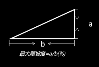 汽車的最大爬坡度,是指汽車滿載時在良好路面上用第一檔克服的最大坡度,它代表了汽車的爬能力。而經(jīng)行業(yè)規(guī)定,只有百分比坡度標(biāo)注方式才是符合標(biāo)準(zhǔn)的。《中國汽車行駛道路修造規(guī)定》規(guī)定:地下機(jī)動車道,直線坡道坡度不大于8.7°,曲線坡道坡度不大于6.8°。而對于公路來說,二級城市道路縱坡不超過5%,高速公路平原<3%,山區(qū)<5%,最差的山區(qū)道路約為10%。
