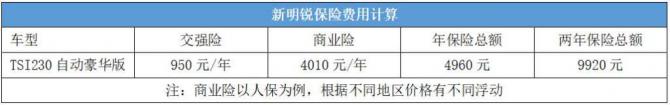 保險(xiǎn)費(fèi)用主要列舉交強(qiáng)險(xiǎn)和商業(yè)險(xiǎn)兩部分。交強(qiáng)險(xiǎn)部分,根據(jù)規(guī)定5座車型按“家用6座以下”車型購(gòu)買交強(qiáng)險(xiǎn),需支付金額950元。商業(yè)險(xiǎn)部分,根據(jù)大家普遍的購(gòu)買習(xí)慣,將商業(yè)險(xiǎn)限定為第三者責(zé)任險(xiǎn)(賠付額度50萬(wàn))、車輛損失險(xiǎn)、不計(jì)免賠特約險(xiǎn)。由此得出新明銳TSI230自動(dòng)豪華版兩年的保險(xiǎn)費(fèi)用為9920元。