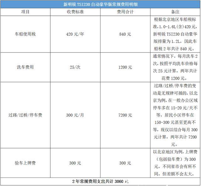 除了上面提到的保險(xiǎn)費(fèi)用、燃油費(fèi)用和保養(yǎng)費(fèi)用外,常規(guī)的用車支出也是一筆不小的開(kāi)銷。我們暫定為車船使用稅、洗車費(fèi)用、過(guò)路/過(guò)橋/停車費(fèi)、驗(yàn)車上牌費(fèi)等,2年常規(guī)費(fèi)用支出共計(jì)3060元。具體收費(fèi)標(biāo)準(zhǔn)及費(fèi)用支出詳見(jiàn)下表: