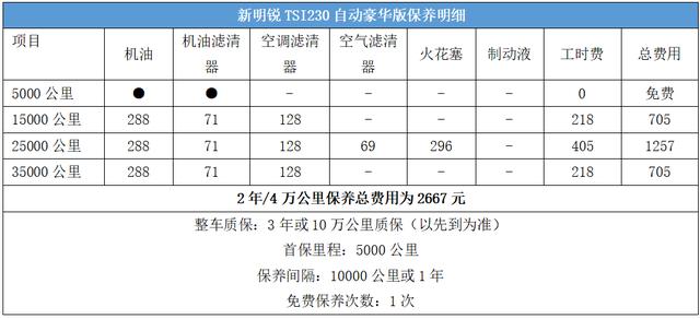 主要保養(yǎng)項(xiàng)目包括機(jī)油、機(jī)油濾清器、空調(diào)濾清器、空氣濾清器、火花塞以及制動(dòng)液。其中,機(jī)油、機(jī)濾、空調(diào)濾清器為每次必?fù)Q,其他保養(yǎng)項(xiàng)目的更換頻率都較低。以大部分車主選擇的5W-40嘉實(shí)多機(jī)油計(jì)算,新明銳常規(guī)保養(yǎng)更換機(jī)油、機(jī)濾、空調(diào)濾清器的價(jià)格為705元。35000公里時(shí)需要在常規(guī)保養(yǎng)項(xiàng)目上增加空氣濾清器和火花塞兩個(gè)項(xiàng)目,價(jià)格為1257元,價(jià)格還是比較合理的。由此可以得出,新明銳TSI230自動(dòng)豪華版2年/4萬(wàn)公里的保養(yǎng)總費(fèi)用為2667元。