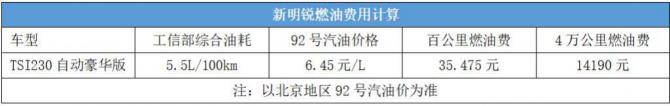 新明銳TSI230自動(dòng)豪華版搭載1.2T發(fā)動(dòng)機(jī),我們以工信部油耗為準(zhǔn),這款車的百公里綜合油耗為5.5L。目前,北京地區(qū)92號(hào)汽油價(jià)格為6.45元/L。由此計(jì)算出該車行駛4萬(wàn)公里的燃油費(fèi)用為14190元。