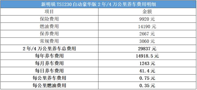 全文總結(jié):根據(jù)養(yǎng)車費(fèi)用=保險(xiǎn)費(fèi)用+燃油費(fèi)用+保養(yǎng)費(fèi)用+常規(guī)費(fèi)用,新明銳TSI230自動(dòng)豪華版2年/4萬(wàn)公里養(yǎng)車總費(fèi)用為29837元,月均養(yǎng)車費(fèi)用為1243元,日均養(yǎng)車費(fèi)用為41.4元,每公里養(yǎng)車費(fèi)用為0.75元。各項(xiàng)養(yǎng)車支出明細(xì)如下: