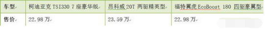 像劉看山這樣的購車者,他們?cè)谟^察配置表的時(shí)候,第一眼瞄到的是頂配車型的配置,然而在預(yù)算的限制之下,中高配車型則是他們的首選。劉看山糾結(jié)的三款車型中,柯迪亞克TSI330 7座豪華版、昂科威20T 兩驅(qū)精英型、翼虎EcoBoost 180 四驅(qū)豪翼型的配置在全系車型中都居于中高配層次,不過相比后兩款車型,柯迪亞克TSI330 7座豪華版明顯在價(jià)格對(duì)等的情況下做到了配置最優(yōu)。