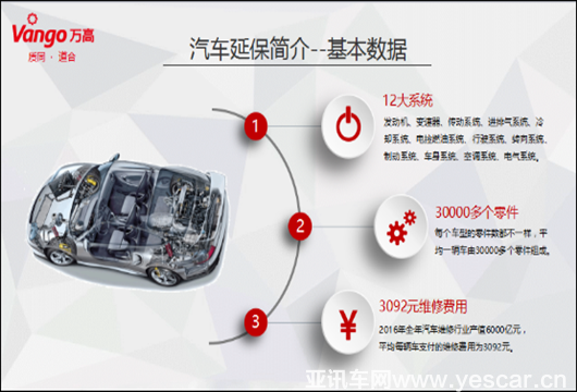 汽車延保包含三大數(shù)據(jù)。第一個數(shù)據(jù)是汽車的12大系統(tǒng),該數(shù)據(jù)每個公司區(qū)分都有差異,而萬高則是按照汽車各個部件承擔(dān)的功能進(jìn)行區(qū)分,分為發(fā)動機(jī)、變速器、傳動、進(jìn)排氣、冷卻、電控燃油、行駛、轉(zhuǎn)向、制動、車身、空調(diào)、電氣系統(tǒng)。