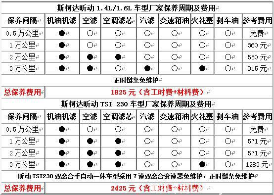 在保養(yǎng)價格上,采用1.4L和1.6L自然吸氣發(fā)動機的昕動更換機油機濾的小保養(yǎng)參考花費約為360元,換機油機濾和空調(diào)濾芯、空濾以及火花塞的大保養(yǎng)參考花費約為915元,從上表中我們可以看出,斯柯達昕動1.4L或1.6L車型行駛3萬公里,包含材料費和工時費的總保養(yǎng)費用為1825元,而搭載1.4TSI發(fā)動機的車型3萬公里總保養(yǎng)費用則為2425元。