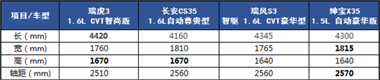 (瑞虎3、長(zhǎng)安CS35、瑞風(fēng)S3、紳寶X35車身數(shù)據(jù)對(duì)比)