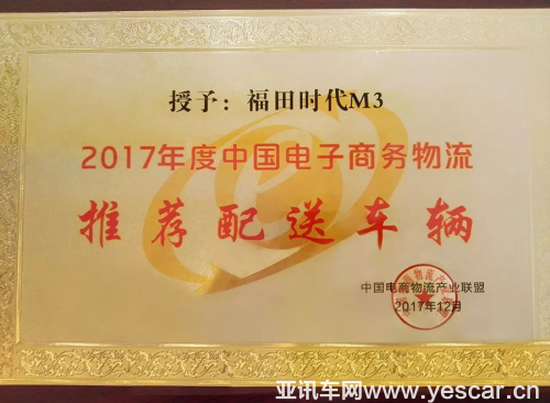 2017年12月20日,福田時(shí)代M3在第七屆中國電子商務(wù)與物流企業(yè)家年會(huì)頒獎(jiǎng)典禮上榮獲“2017年度中國電子商務(wù)物流推薦配送車輛”殊榮,為福田時(shí)代M3的優(yōu)秀品質(zhì)與魅力又增添了實(shí)力的見證與榮耀的光輝。