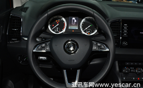 上汽斯柯達(dá)柯珞克方向盤造型與柯迪亞克的完全一致,兩側(cè)的多功能按鍵布局合理,按鍵手感出色,涵蓋了多媒體、藍(lán)牙電話以及行車電腦顯示屏功能。儀表盤方面,傳統(tǒng)的雙圓式儀表盤外采用了白底的設(shè)計(jì),與柯迪亞克一致。