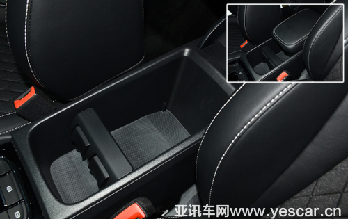 擋把后方的儲(chǔ)物空間則比較有意思,將杯托與扶手箱整合在了一起。前端為帶有限位裝置的杯托,后方則是一個(gè)較深的儲(chǔ)物格。