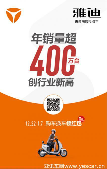 突破400萬輛大關(guān)既是屬于雅迪的榮耀時(shí)刻,更是中國電動(dòng)車行業(yè)發(fā)展歷程中的重點(diǎn)里程碑。在消費(fèi)水平不斷升級(jí)的當(dāng)下,雅迪執(zhí)守匠心,整合國際資源打造的“更高端”電動(dòng)車,讓更多經(jīng)銷商加入到雅迪大家庭,并讓更多消費(fèi)者體驗(yàn)到高端兩輪電動(dòng)車產(chǎn)品和五星級(jí)售后服務(wù),同時(shí),引導(dǎo)行業(yè)健康發(fā)展,引領(lǐng)產(chǎn)業(yè)轉(zhuǎn)型升級(jí)。