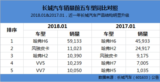 2017年1月,長城汽車銷量91,233臺,僅有哈弗H6、哈弗H2兩款車型銷量破萬,一年后的2018年1月,長城汽車銷量110,040臺,有哈弗H6、風駿皮卡、哈弗H2、VV5、VV7共5款車型月銷量突破萬臺,涵蓋豪華型、緊湊型、小型和皮卡,產(chǎn)品結構明顯優(yōu)化。特別是SUV品類,與一年前H系產(chǎn)品獨撐天下相比,一年后WEY、H系和M系同堂,產(chǎn)品更趨豐富。據(jù)悉,2018年,在現(xiàn)有車型的產(chǎn)品力更新之外,WEY將有4款新產(chǎn)品上市,哈弗SUV也將推出新的產(chǎn)品系列,長城汽車的產(chǎn)品線將進一步得到優(yōu)化豐富。