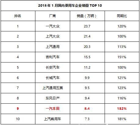 日前,2018年1月中國汽車市場銷量榜單公布,一汽豐田再傳捷報,當(dāng)月其整體銷售8.4萬輛,在企業(yè)銷量排名中排在第九位,從同期比來看,前十名的企業(yè)中一汽豐田排在第二位,依舊保持著強勁的增長勢頭。