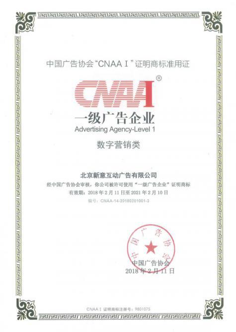 經(jīng)過近半年時間的翔實(shí)準(zhǔn)備,2018年2月11日,新意互動通過中國廣告協(xié)會“CNAA I一級廣告企業(yè)(數(shù)字營銷類)”證明商標(biāo)認(rèn)證,成功躋身國家一級廣告企業(yè)行列。