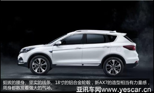 我們轉(zhuǎn)過(guò)車側(cè),看看他的整體身形。挺拔的腰身、堅(jiān)實(shí)的線條、18寸的鋁合金輪轂,新AX7的造型相當(dāng)有力量感,周身都散發(fā)著強(qiáng)大的氣場(chǎng)。