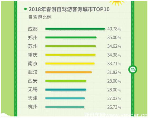 客源城市上,2018春季自駕游人群以準(zhǔn)一線城市和二線城市最為旺盛,成都、鄭州、蘇州排在前三名。令人驚訝的是,北京、上海、廣州等超一線城市竟無一上榜。