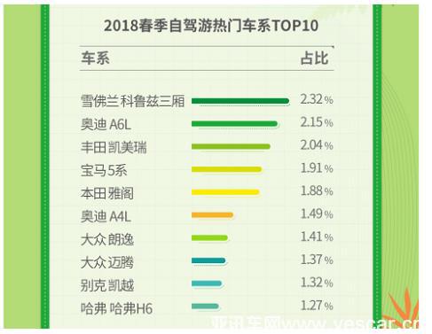 熱門車系方面,雪佛蘭科魯茲三廂、奧迪A6L、豐田凱美瑞等是出游常用選擇。值得一提的是,哈弗H6作為唯一國產(chǎn)品牌成功入圍TOP10,可見這款SUV性價(jià)比之王的火熱程度。