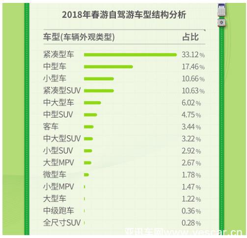 出行用車方面,今年春季居民自駕車出游的車型以緊湊型車和中型車為主,合并占比50.58%。此外,當(dāng)下產(chǎn)銷火爆的SUV車型自然也是熱門選擇,各類型SUV合并占比為21.81%。能夠承載6至7名乘員的中大型SUV、全尺寸SUV以及MPV車型合并占比7.65%,一定程度上驗(yàn)證了家庭自駕游的崛起。