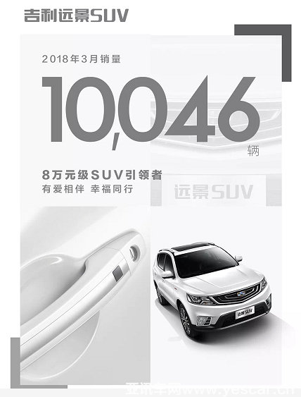 不知不覺,2018年已經(jīng)走過了四分之一,國內(nèi)汽車市場的競爭仍然愈演愈烈,尤其自主車企間的較量更是進入了白熱化階段。之前長期領跑的長安汽車在2017年被吉利超越后,與吉利汽車銷量的距離越拉越遠。4月6日,吉利汽車發(fā)布了最新的銷量數(shù)據(jù),吉利汽車3月份銷量120964輛,同比增長39%,在車市微增長的大環(huán)境下,吉利月銷十萬輛已成常態(tài),大有與大眾等老牌合資車企一決高下的勢頭。一個車企的蒸蒸日上,自然少不了功勛車型的搶眼表現(xiàn),遠景SUV作為銷量榜上的中堅力量,再度擊破萬輛大關,以10046的成績貢獻著穩(wěn)健的基盤銷量。