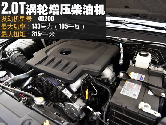 風駿6柴油版車型搭載了一臺2.0T渦輪增壓柴油機,最大功率為143馬力(105千瓦)/4000rpm,最大扭矩為315牛·米/1400-2800rpm,與之匹配的是6擋手動變速箱。(風駿5歐洲版的柴油車型也搭載了這套動力系統(tǒng)。)