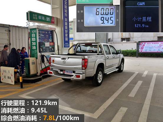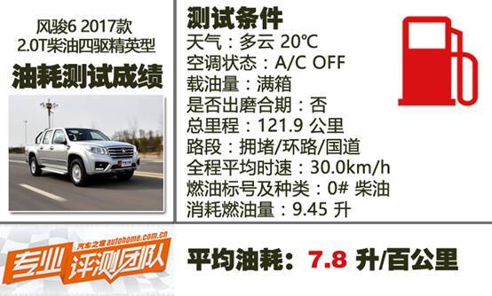 在整個的油耗測試的過程中,我們選擇了擁堵路段和通暢路段的比例大概分別各占50%,測試的平均時速為30km/h。在全程僅一名司機的情況下,總共行駛了121.9公里,共消耗柴油9.45L,換算下來百公里的平均油耗約7.8L,油耗表現(xiàn)還是比較令人滿意的。