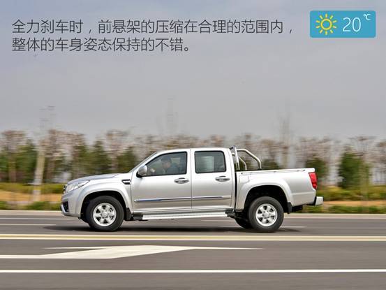 剎車測試方面,風駿6整體上的表現(xiàn)較為線性,制動力度中規(guī)中矩,不過ABS的介入略顯生硬了一些。載重400公斤后,它的剎車距離為16.86米,僅比空載時的剎車距離多了0.99米。