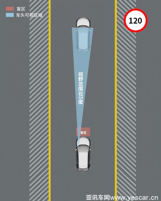 如圖,當(dāng)駕車調(diào)整到標(biāo)準(zhǔn)坐姿,由于引擎蓋過高,或車頭過長(zhǎng)等原因,會(huì)造成前方視野存在“死角”。跟車行駛時(shí),如果找不到最佳的安全距離,這麻煩就大了。在車輛高速行駛時(shí),伴隨速度提升,駕駛者的視野范圍縮小。以120km/h的車速行駛,駕駛者視野范圍僅為5°。