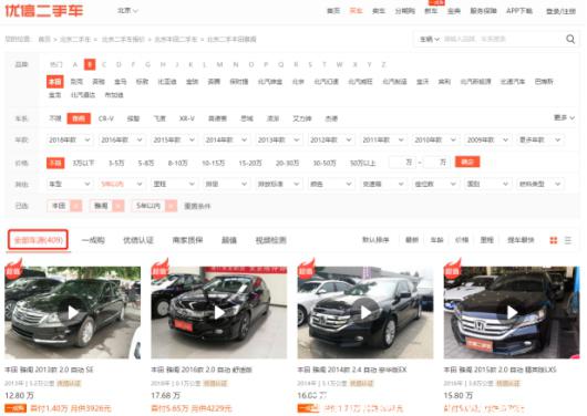 在優(yōu)信官網(wǎng)輸入“雅閣”,選擇車齡“5年以內(nèi)”,顯示在售車源409輛。在瓜子輸入相同的篩選指標(biāo),顯示在售車源20輛,但沒有迎合取消二手車限遷政策,不能擴(kuò)大用戶所在地范圍,這無疑縮小了選擇范圍。再看人人車,同樣的篩選指標(biāo),在售車源僅為12輛,與瓜子二手車相同,都僅顯示用戶所在地的車源。