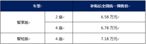 6月12日,隨著新能源補貼新政正式實施,新政對續(xù)航能力和電池能量密度有了更嚴(yán)格的要求,奇瑞新能源順勢推出越級續(xù)航車型奇瑞eQ1小螞蟻 400,6月28日正式開啟預(yù)售,補貼后6.58萬起。預(yù)售的小螞蟻 400共推出了智享版、智炫版兩種版型,補貼后售價公布如下: