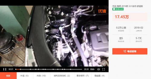 在優(yōu)信二手車網(wǎng)上商城的選車頁面上,我們可以看到除了常規(guī)的檢測報告和靜態(tài)照片之外,每輛車都呈現(xiàn)出了無剪輯無修改的“長鏡頭”視頻驗車效果。通過一段30分鐘左右一鏡到底的視頻內(nèi)容,為消費者更完整地、更真實地展示了車輛外觀、內(nèi)飾、結構件、發(fā)動機及更多細節(jié)方面的狀態(tài),讓消費者對車輛狀態(tài)和品質(zhì)建立起一個直觀的判斷。而且優(yōu)信這樣360°無死角的視頻看車技術,能保證視頻中看到的和真實車況沒有“出格”的誤差,讓消費者真正做到“所見即所得”,避免出現(xiàn)千里迢迢去現(xiàn)場看車卻因為種種不滿而不得的失望情況。