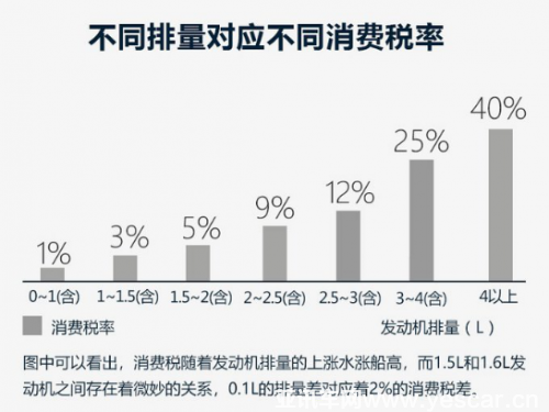 汽車消費(fèi)稅是1994年國家稅制改革中設(shè)置的一個(gè)稅種,2008年9月1日起調(diào)整只針對(duì)廠家征收的汽車消費(fèi)稅政策,包括提高大排量乘用車的消費(fèi)稅稅率,以及降低小排量乘用車的消費(fèi)稅稅率。從稅率表也可以看出,1.6L發(fā)動(dòng)機(jī)處于一個(gè)十分尷尬的位置,因此用0.1L排量撬動(dòng)2%消費(fèi)稅也成為各大車企樂此不疲的事。