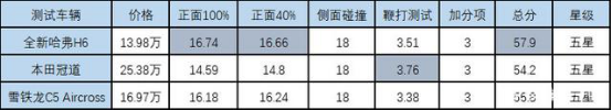 在新規(guī)C-NCAP碰撞測試中,全新哈弗H6以57.9分的總分,獲得五星安全認證,其中100%正面碰撞、40%正面偏置碰撞這兩項最能反映車身結(jié)構(gòu)安全性的測試中,全新哈弗H6分別獲得16.74分、16.66分的高分,超過了本田冠道、雪鐵龍C5等合資品牌。