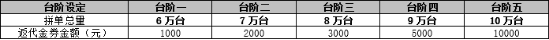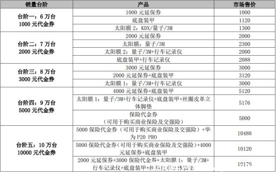 第二重驚喜:拼單總量享驚喜,再返最高萬(wàn)元代金券。拼單購(gòu)車(chē)總量達(dá)到指定6萬(wàn)輛等銷(xiāo)量臺(tái)階,最高可返10000元代金券,代金券可用于購(gòu)買(mǎi)相對(duì)應(yīng)的精品或延保產(chǎn)品。(詳見(jiàn)下表)