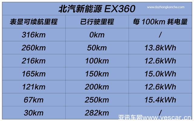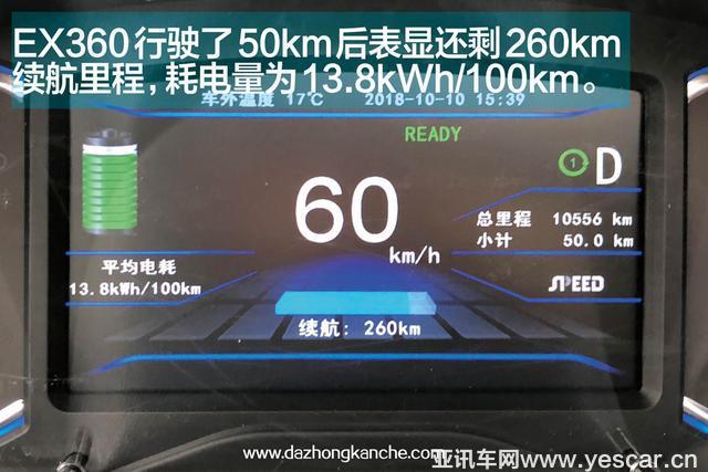 在環(huán)路上行駛了50km之后,北汽新能源EX360的表顯續(xù)航260km,同時耗電量僅為13.8kWh/100km。