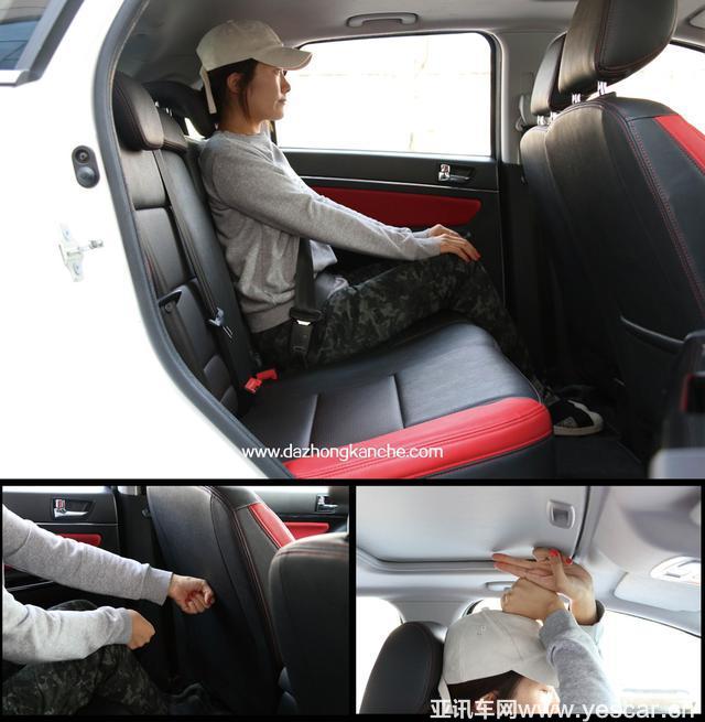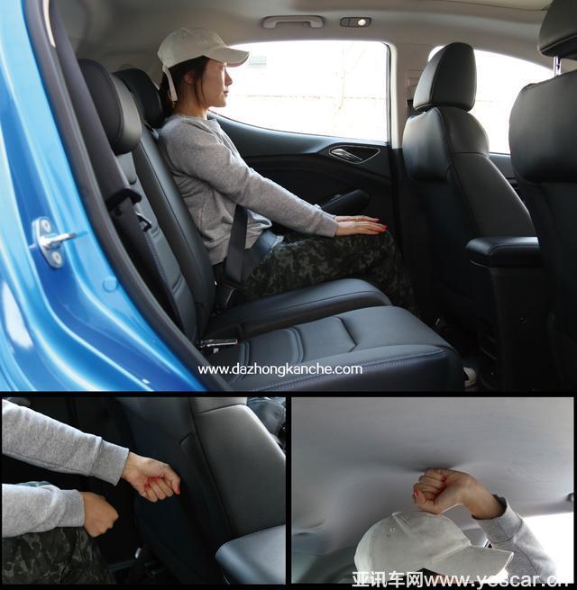 在元EV360里身高167cm的體驗者調(diào)好座位后,前排頭部空間還有一拳兩指頭,坐入后排后,第二排頭部空間只有一拳,膝部空間超過三拳。