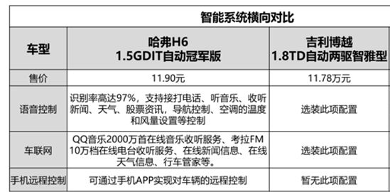 再來看看吉利博越,它也是支持智能系統(tǒng)的。但其略顯遜色的是,車聯(lián)網(wǎng)、手機(jī)遠(yuǎn)程控制以及語音控制系統(tǒng),均為選裝功能,使用起來并不是那么方便,所以僅憑這一點(diǎn),這一局哈弗H6再次勝出。