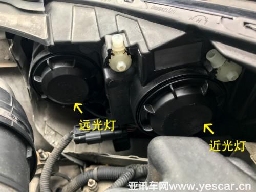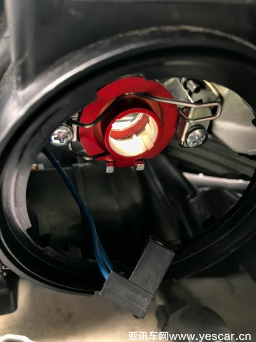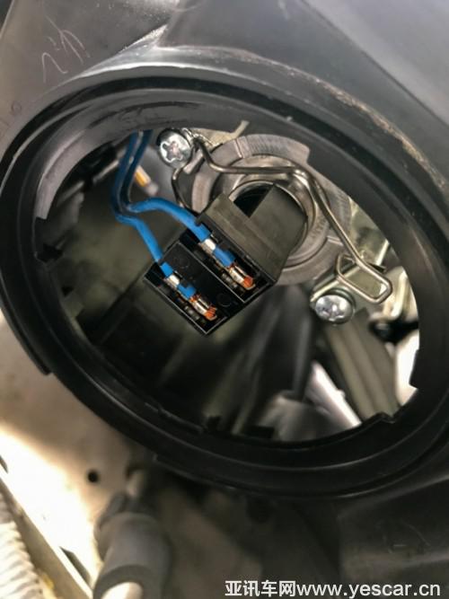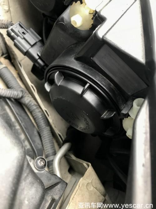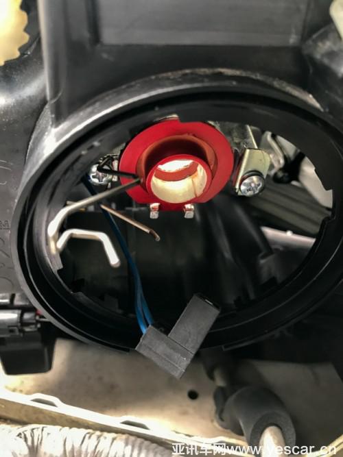 步驟二:擰開(kāi)近光燈的防塵蓋后,可以看到一個(gè)插頭插著原車鹵素?zé)?,結(jié)構(gòu)并不復(fù)雜,應(yīng)該不難操作。