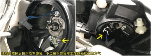步驟三:接著把插頭拔掉,按下原車彈簧,這個(gè)彈簧就是把燈泡固定位置用的。
