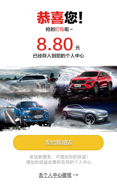 H5形式無疑為營銷信息帶來隨時隨地、無處不在的入口,但如何促使大眾“推門而入”仍是一道很高門檻。哈弗超級海報H5做法就是撒錢,不過是比較聰明地撒錢。采用有門檻的任務形式,參與分享領取現(xiàn)金紅包。不同于點開即可拿錢的簡單套路,燒錢培養(yǎng)一批沒有黏性的用戶。哈弗超級紅包通過簡單的保存、分享再上傳的環(huán)節(jié),潛在培養(yǎng)了用戶的“游戲”模式。