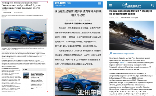 新華社報刊網(wǎng)的俄羅斯之行還專程趕赴莫斯科的哈弗4S店,發(fā)布題為《探訪在俄經(jīng)銷商 揭開長城汽車海外持續(xù)增長的秘密》的報道。文中指出,哈弗高標準建造的經(jīng)銷商門店,不僅滿足了在海外市場的推廣需求,也為自主品牌在海外市場樹立起新的形象標桿。新華網(wǎng)將哈弗F7定義為“長城汽車海外戰(zhàn)場沖鋒陷陣的先鋒軍”,認為這款自誕生之初就定位于“全球車”的車型,將幫助哈弗進一步樹立高端品牌形象,同時挑戰(zhàn)韓系品牌,沖擊俄羅斯SUV細分市場第一。