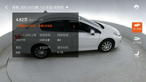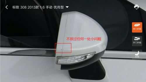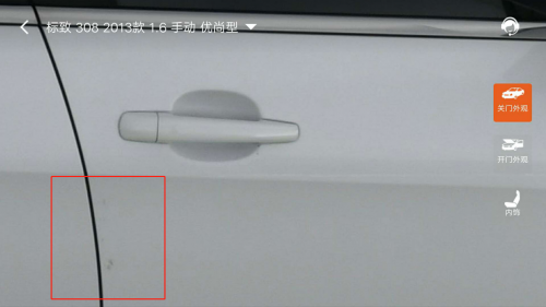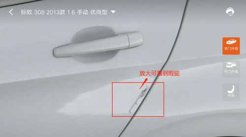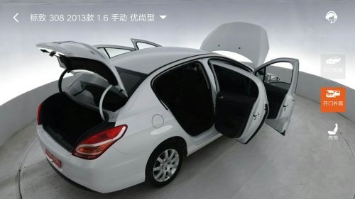 在使用VR全景看車過程中,一款總價(jià)在4.82萬元的2013年標(biāo)致308手動(dòng)1.6優(yōu)尚型,成為她的選購對(duì)象。劉小姐在優(yōu)信APP里,點(diǎn)開這一款車的“外觀”選項(xiàng),就進(jìn)入到VR看車場景,前后360度旋轉(zhuǎn),可以看到車輛整體效果,幫她確定是不是自己喜歡的類型。如果想了解細(xì)節(jié),可以放大某一處,查看比如后視鏡、車門刮蹭情況等。