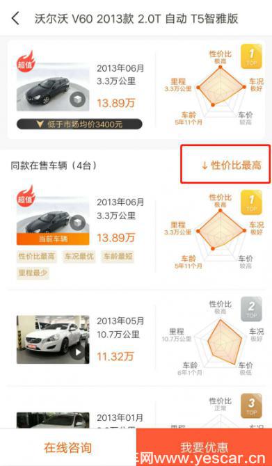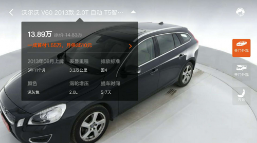 舉例而言,一款沃爾沃V60 2013款2.0T自動(dòng) T5智雅版,平臺(tái)價(jià)格為13.89萬。在VR看車體驗(yàn)過程中能夠看到,內(nèi)部空間大且舒適感高。再從數(shù)據(jù)對(duì)比中不難看出,本款車型無論從性能上還是價(jià)格上,綜合排名都在第一位。僅僅從線上就能非常直觀地獲取這些多維度的車況資料,實(shí)在也是讓用戶感受到科技發(fā)展的所帶來的便利。