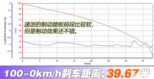 剎車成績也是同級(jí)別中大多數(shù)車型的表現(xiàn),舒適性取向的懸架也沒有太過分的點(diǎn)頭現(xiàn)象,而剎車腳感可能需要適應(yīng)下,前段有一點(diǎn)點(diǎn)偏軟,而且制動(dòng)力度比較大,這個(gè)要控制好。到了中后段剎車就算比較線性的了,連續(xù)幾組測試下來也沒有熱衰減現(xiàn)象。